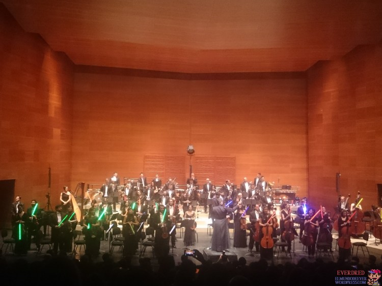 En cuanto al musical en sí, es cierto que nada más entrar nos daban el programa, lo cual me pareció un tanto innecesario, ya que era el programa que iban a seguir al pie de la letra, sabíamos qué iba a sonar en todo momento, creo que eso le quitaba algo de sorpresa. Sí, sí que hubo sorpresa final, qué menos, sino hubiese sido un tanto decepcionante, pero no fue así. La sorpresa final era evidente, «La Marcha Imperial» y además con sables laser, toda una maravilla, se lo curraron y mucho, ¡qué sorpresa! y ¡menuda forma de terminar! Técnicamente no fue el final, ya que después tocaron el tema de «La Banda de la Cantina» por una segunda vez con todo el público bailando, simplemente maravilloso.