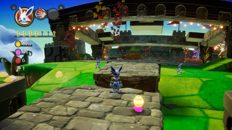 La premisa de los disfraces era lo más interesante y atractivo del juego. Sin duda fue lo que más me atrajo en los primeros videos del mismo. El personaje protagonista cuenta con decenas de disfraces y puede cambiar entre ellos a placer con los gatillos L y R. Cada disfraz otorga al personaje distintas habilidades, o eso prometían, pero esto también se ha quedado en una enorme decepción. Como veis en la imagen superior, lo único que cambia según el disfraz, es la habilidad de salto. Sí, así es, cada disfraz nos proporciona una modificación en la habilidad de Saltar. Obviamente no todos saltan, hay disfraces como el de Dragón, que nos permitirán lanzar bolas de fuego, pero no saltar. Un tanto cómico sí.