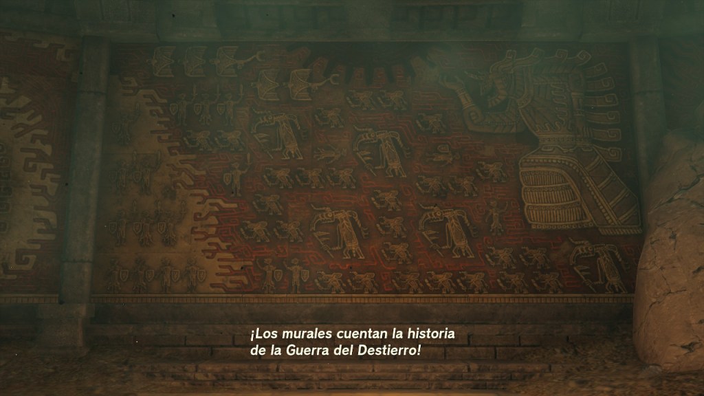Una vez llegamos a una sala de tamaño considerable la princesa quedó fascinada con unos grandes murales de una de las paredes, los cuales narraban una gran guerra que puso en jaque al reino hace muchos años. Una batalla donde el Reino de Hyrule estuvo a punto de perder ante el devastador poder del Rey Demonio. La llamada Guerra del Destierro.