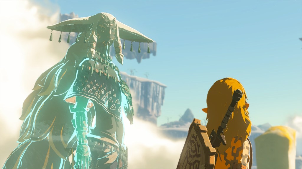 Una vez en el Templo, la puerta no se abrió. En ese momento apareció ante mi Rauru, quien dijo ser el dueño de mi nuevo brazo. Me pidió que completase los desafíos de tres santuarios para restaurar el poder del brazo y así poder acceder al Templo.