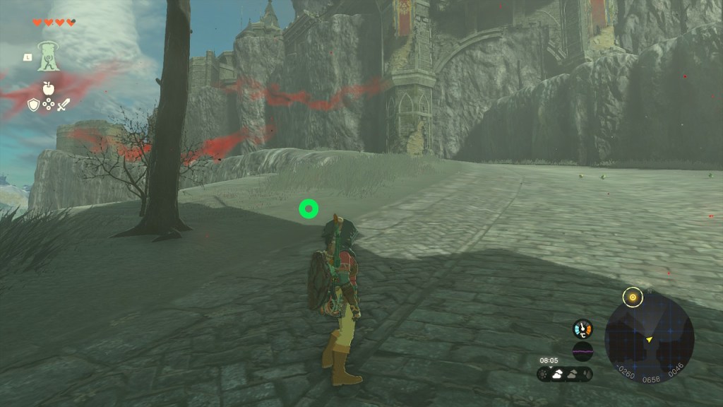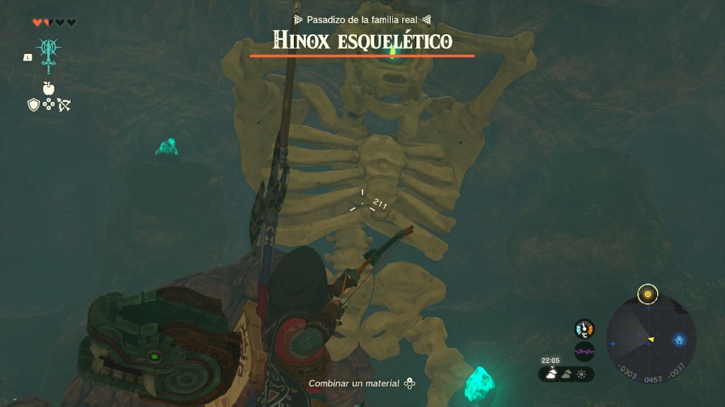 Entonces accedí escalando a una entrada al castillo por la parte trasera. Hablé con un guarda que me dijo que custodiaba un gran arsenal real. Accedí por una trampilla y descendí varios pisos luchando contra Horroblins, lizalfos azules y bokoblins negros y obtuve armamento de gran calidad. Tras perderme un buen rato por algunas cuevas llegué a una sala bastante amplia con un gran montón de piedras. Cuando destruí gran parte de ellas, resultó que abajo, enterrado, se hallaba un enorme Hinox Esquelético que comenzó a atacarme. Me había metido donde no debía, en la boca del lobo, y no estaba ni mucho menos en condiciones de derrotarle. Tras gran sufrimiento y perder varias de mis armas más valiosas logré hacerle morder el polvo.