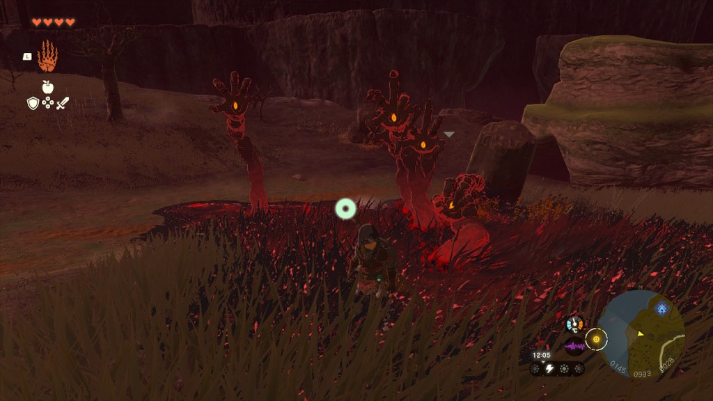 Comencé explorando la nueva región por la parte noreste. Me encontré con un Hinox con refuerzos en algunas de sus extremidades que no me puso las cosas nada sencillas. Después me volví a cruzar con unos viejos amigos, los secuaces del clan Yiga. Quienes siguen obsesionados con acabar con mi vida.