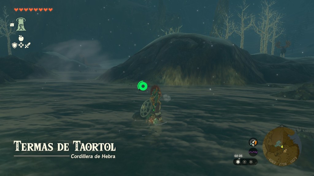 Explorando la región hacia el interior encontré una enorme pared de hielo que tuve que derretir para descubrir una cueva. Una cueva que escondía un acertijo. En la zona central tenía una potente corriente de aire, pero el fondo parecía un pozo. Fijándome bien descubrí paredes de piedra fáciles de romper con armas o flechas bomba. Una vez rotas, de algunas de estas brotó agua que llenó el fondo de la cueva. Esto abrió el camino hacia un cofre. Este contenía un casco mágico. Se trataba del tesoro del manantial, la misión que Tureli me encomendó en el poblado.