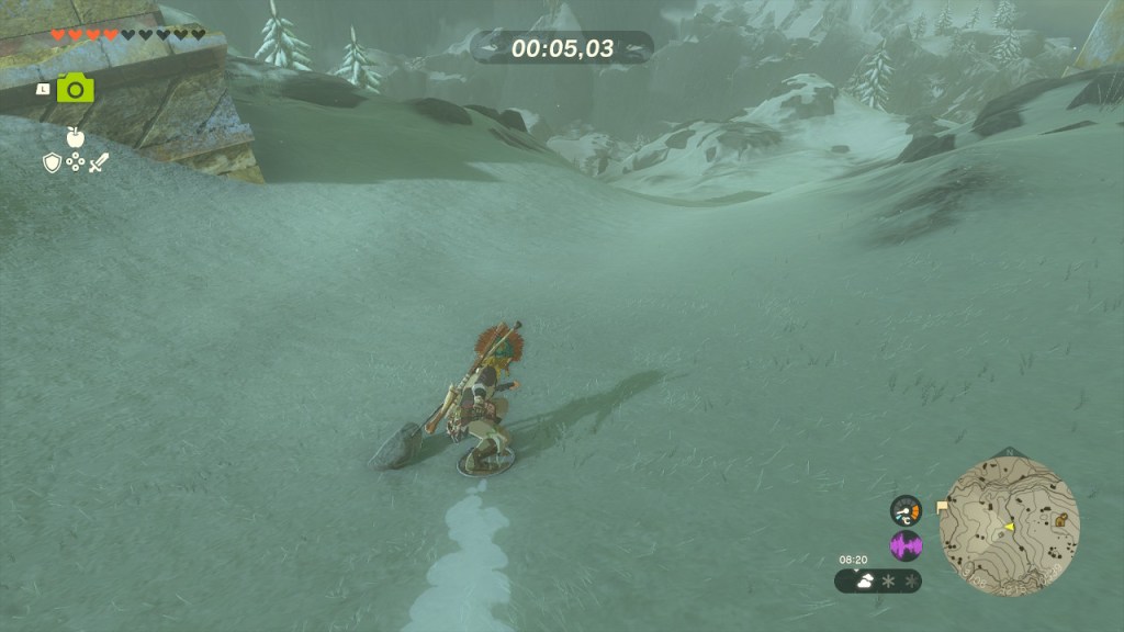 Continué explorando la zona helada desde su parte más exterior. Me encontré, escondido, un santuario que completé con facilidad utilizando la habilidad de Retroceso. Más adelante tuve que enfrentarme a un nuevo Glaciarock. Pegan muy duro, soy incapaz de aguantar más de un golpe. Le lancé flechas bomba para retirarle el hielo del cuerpo y así poder escalar su superficie y golpearle con mi mejor arma en el punto débil.