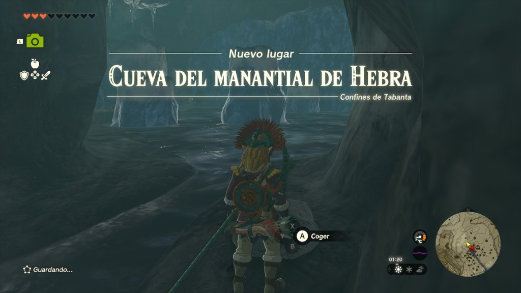 En los fragmentos cercanos a la anterior región encontré una cueva, un manantial. Ahí obtuve bastantes minerales y un nuevo emblema de fantasmo. Fuera estaba esperando un nuevo Hinox, uno rojo, uno sencillo. Además, no tenía protección en los tobillos, fue realmente fácil de derrotar.
