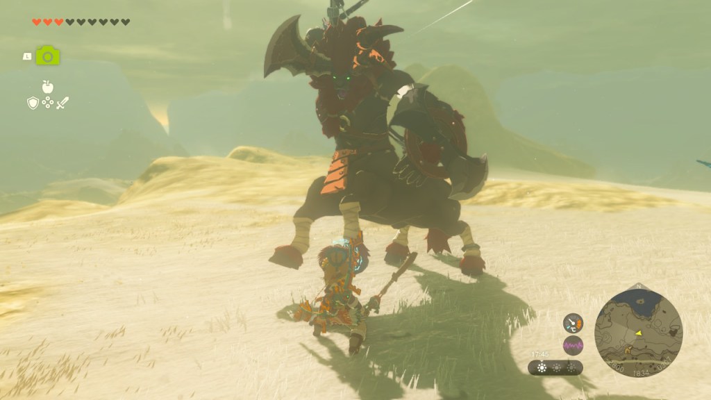 Siguiendo hacia el sur me encontré con un campamento de bokoblins. Ahí me crucé con el primer bokoblin plateado. Me dio muchos quebraderos de cabeza. Tienen gran cantidad de salud y pegan muy fuerte. Tras liquidar a todos los enemigos del campamento, obtuve un arma bastante poderosa en el cofre.
