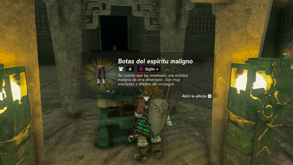 Ahora sí comencé a explorar el laberinto de una manera más relajada. El aura maligna del suelo era realmente molesta, pero no quedaba otra que cruzar lo más rápido posible esos charcos. Subí en varias ocasiones con infiltración para orientarme. Tuve que ir derritiendo varios bloques de hielo con antorchas u hogueras. Sin contar la entrada, en los otros 3 extremos había un cofre con armas realmente interesantes. Tras mucho sufrimiento logré encontrar el acceso a la sala central, donde esperaba un santuario que no suponía desafío alguno. Tras completarlo activé un terminal con el brazo y este me dijo que debía dirigirme ahora al cubo de los cielos.