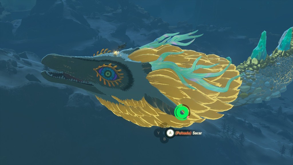Me costó mucho dar con su paradero, estaba en constante movimiento. Fue gracias a la música que me di cuenta de que un Dragón andaba cerca. ¡Eso es! Por eso la Espada no para de moverse. Subí a una isla celeste y me lancé con la paravela. La espada estaba clavada en la cabeza del Dragón. Procedí a sustraerla. El Dragón se retorcía de dolor y eso mermaba mi resistencia. Afortunadamente tenía suficiente y logré aguantar los zarandeos. Entonces se calmó y pude extraer la Espada Maestra de su cuerpo. Esta estaba completamente restituida.