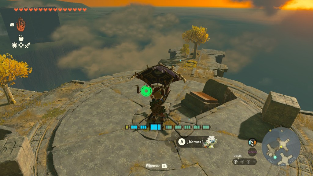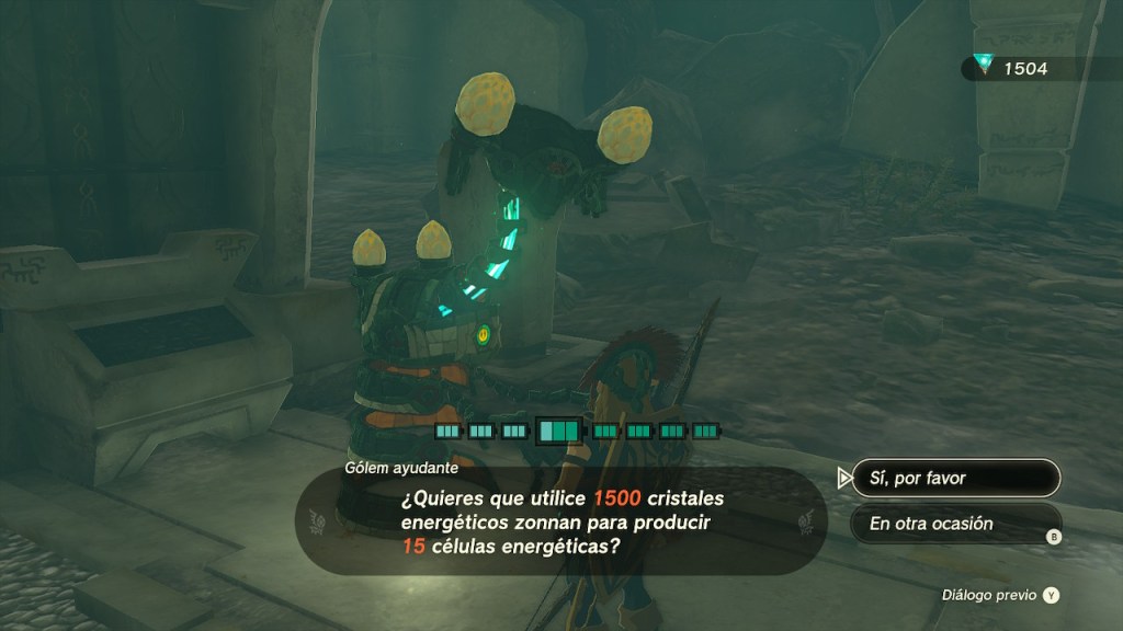 Una vez igualados ambos mapas procedí a gastar todo el zonnanio en cristales. Una vez hecho, fui a intercambiar estos por Células energéticas. Tenía para 15 Células, lo que viene siendo 5 pilas completas nuevas. Un gran incremento sin duda, ahora podré utilizar la máquina voladora sin preocupación por sus baterías. También obtuve un par de Contenedores de Corazón nuevos con los santuarios que llevaba completados.