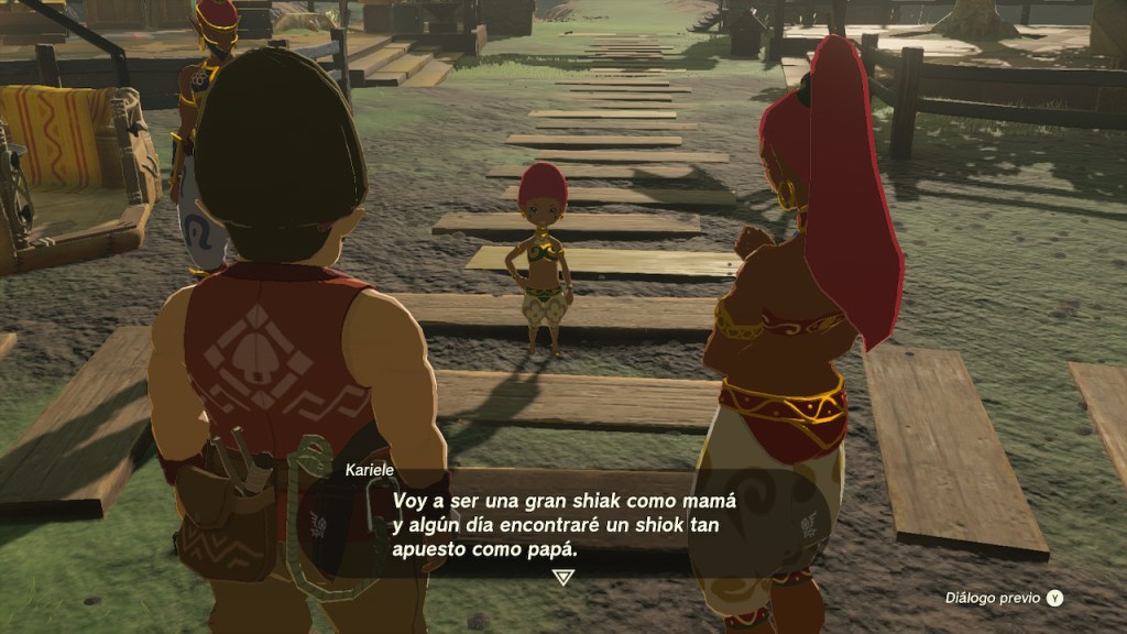Me encontré con Karid, el jefe de la compañía de construcciones y con su mujer Kaenne. Su hija Kariele debía marchar a la Ciudadela Gerudo para ser formada como dictan las normas de esa tribu. Esto provocaba que sus padres estuviesen alicaídos. Me reuní con la joven y la ayudé a llegar a la zona de construcción para reunirse con su padre Karid. Este me pidió algunos materiales para tintar un globo de amarillo y poder regalar a su hija un breve viaje en globo antes de su partida. Poco después llegaron a recogerla y todo el pueblo se reunió para despedirla. Una escena realmente conmovedora. La visitaré cuando llegue a la Ciudadela Gerudo.