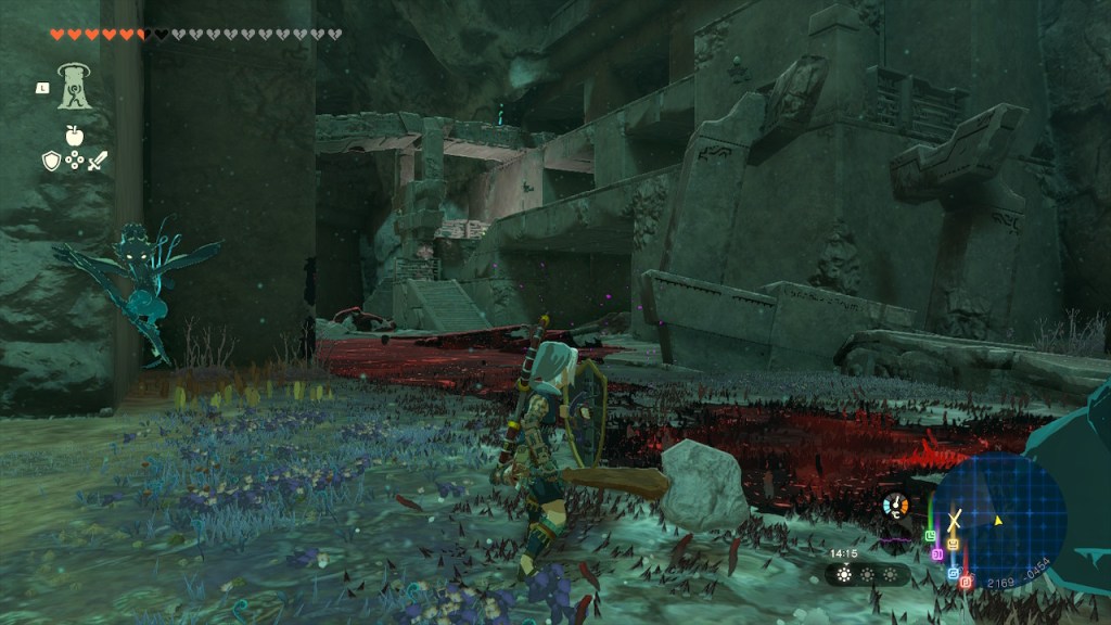 Continué explorando la región. Me crucé con un nuevo Centaleón que vencí con facilidad y encontré un nuevo santuario. En el Lago Calavera encontré un nuevo abismo que conectaba con el subsuelo. Se trataba de una pequeña cueva. En ella tuve que derrotar a varias criaturas esqueléticas y me recompensaron con la Espada de Biggoron, en un cofre. Encontré una nueva raíz y regresé a la superficie. Cerca del abismo encontré una cueva. En ella tuve que enfrentarme a un Hinox Esquelético y encontré un cofre con la Máscara de la Deidad, otro tesoro de Nambod.