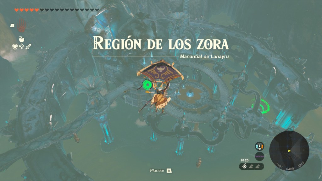 No quería perder más el tiempo, así que saqué mi máquina voladora y me dirigí a la atalaya de la nueva región, la cual estaba un poco lejos. Esta región tenía gran cantidad de islas celestes, eso ya me iba indicando lo que me iba a encontrar. Sí, se trataba de la región de los Zora, me di cuenta al sobrevolar la ciudad. La atalaya estaba rodeada de fango, no pude acceder a su interior, no sabía como retirarlo. Así que me subí de nuevo a la máquina voladora y me dirigí a la ciudad de los Zora.