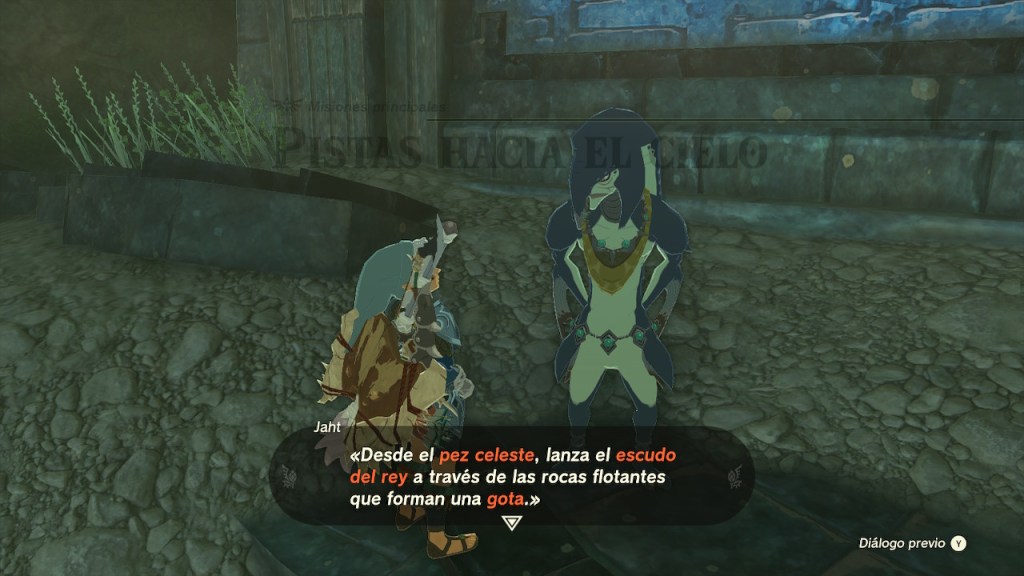 Volví a hablar con Sidon. Debíamos buscar el pez celeste para dar con la gota. Ascendí con mi máquina voladora y di con una isla con forma de pez. Estaba rodeada de piedras flotantes. Un grupo de ellas me percaté de que formaban una gota. Lancé una flecha con la escama del rey a su interior. Eso hizo aparecer una luz en el lago.