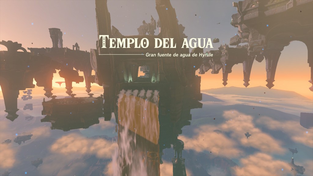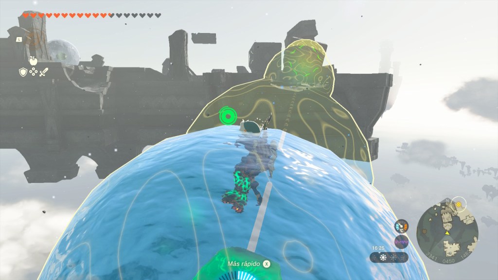 Estábamos en las islas celestes sobre el reino de los Zora. La gravedad era menor en ellas y había esferas acuosas que se desplazaban en el aire. Las utilicé para seguir avanzando entre las islas, mientras derrotaba a algunos gólems y encontraba tesoros.