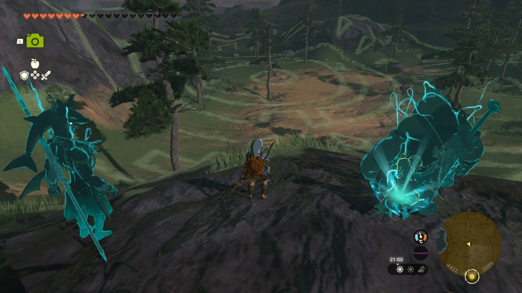 Me crucé con algún monstruo grande mientras me dirigí a activar las raíces bajo los santuarios. Asalté los diversos campamentos de monstruos para acumular zonnanio y continué activando raíces. Encontré una mina con grandes cantidades de zonnanio y en ella hallé un cofre con el pantalón de los Cielos. Me encontré con un campamento del Clan Yiga y obtuve su esquema. También combatí con Gólems Cúbicos de diverso rango. Me crucé con varios monstruos grandes más y activé otra raíz. Mientras me dirigía a la siguiente tuve que enfrentarme a un Centaleón plateado acorazado. Por suerte tenía poderosas armas que le infligían un gran daño, pero sus ataques eran realmente peligrosos. Me quedaban pocas raíces, derroté a algunos enemigos más y las terminé activando todas, no sin antes asaltar una nueva base del Clan Yiga.