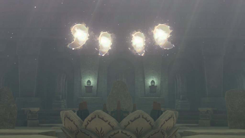Tras rodear la bahía terminé llegando a la localización de un nuevo geoglifo. Vi un nuevo recuerdo de la princesa Zelda. Rauru estaba hablando con los 4 guerreros de las distintas tribus y con Zelda. Les comentaba que no era posible repeler al Rey Demonio y que se ocuparía él mismo. En ese momento abrió una cámara donde aguardaban las gemas de los Zonnan y entregó una a cada guerrero. Estas se tornaron del color del poder de cada guerrero y se acoplaron a su cuerpo. Todos juraron servir al Rey y dar su vida por Hyrule.