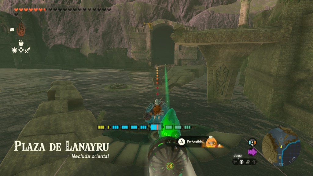 Me dirigí a explorar la zona más al este. Combatí con un centalón azul y terminé hallando una cueva. Tras una cascada encontré una piedra verde. La transporté con un planeador a través de la plaza de Lanayru hasta el lugar donde se convirtió en santuario. Cerca hallé otra cueva. Tuve que abrirme paso a través de varias paredes de rocas haciendo uso de la habilidad de Yunobo. Tras una de estas encontré un nuevo santuario.