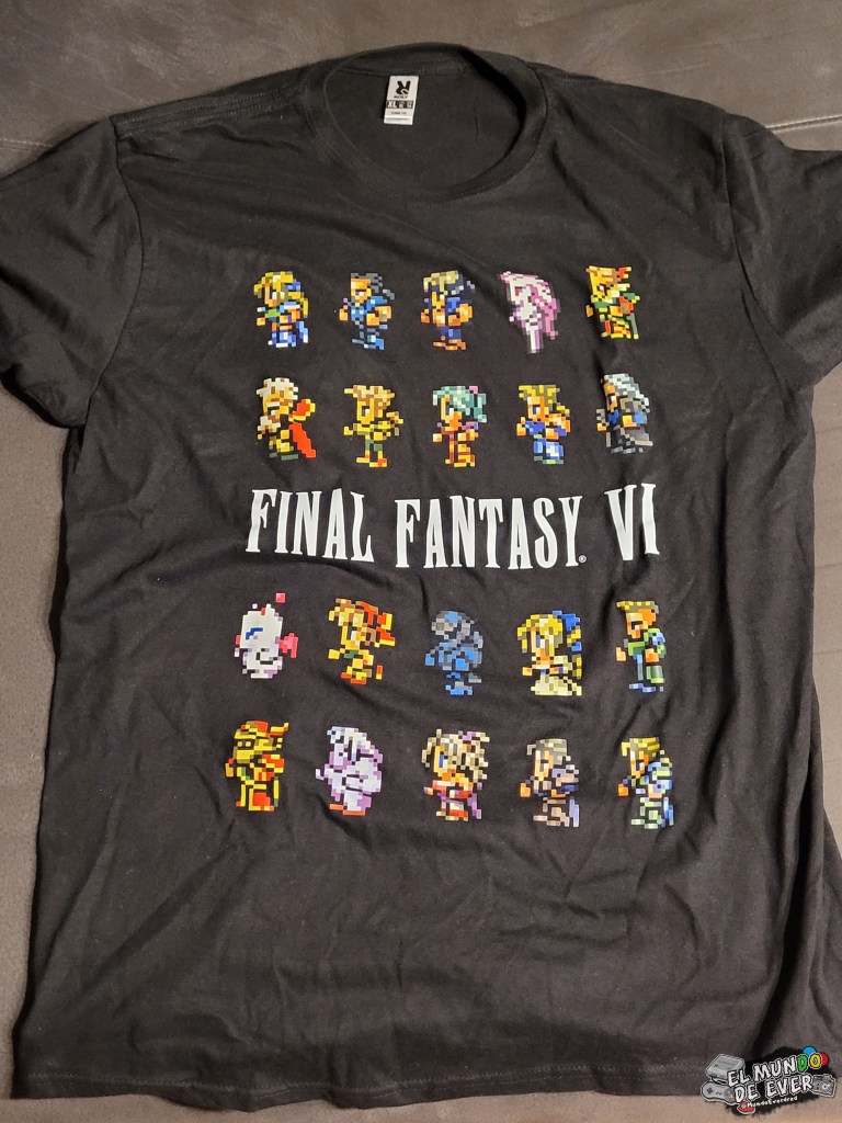– Camiseta de Final Fantasy VI: Desde que la vi ni lo dudé. Un juego que me he pasado este verano y que me ha gustado bastante. Además, aparecen todos los personajes y algunos de ellos con sus variantes. Una pena que sea negra la camiseta, ya que tengo muchas, pero esta no la podía dejar pasar, pocas veces se ve ropa de grandes clásicos de la historia del videojuego.