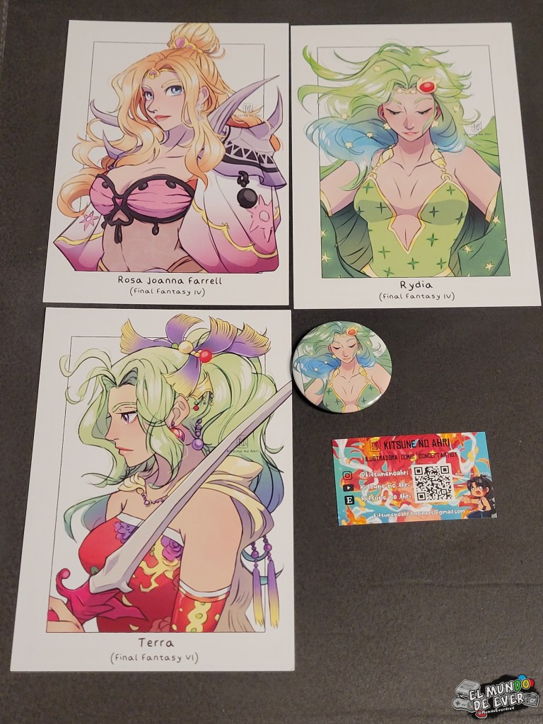 – Prints de Rosa y Rydia de Final Fantasy IV y de Terra de Final Fantasy VI: Mi amor por los Final Fantasy de Super Nintendo no conoce límites. Cada vez que veo algo relacionado con esos juegos lo deseo con toda mi alma. No pude evitar llevarme estos preciosos dibujos de unas chicas tan geniales y fuertes.