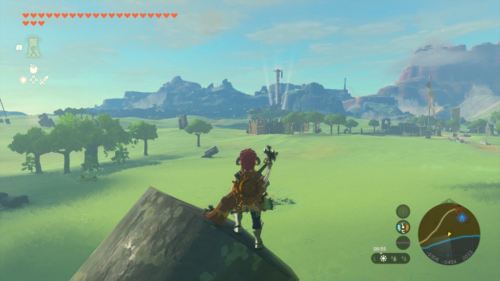 Comencé dirigiéndome hacia la atalaya. Esta estaba fortificada y custodiada por un grupo de enemigos de diverso rango, entre los que destacaba un gran bokoblin plateado. Una vez derrotados logré acceder a la atalaya, activarla y obtener el mapa de la superficie y el de los cielos.