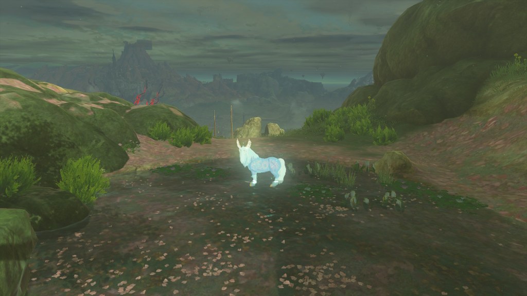 Entonces marché a investigar una zona a la izquierda rodeada por el río. En lo alto de una montaña encontré un cerezo. Hasta ahora nunca había realizado una ofrenda en ellos, pero esta vez lo hice. Entonces apareció Satoly y me marcó la ubicación de varias cuevas con un rayo de luz. Continué explorando la montaña y encontré un nuevo santuario. Al pie de la montaña me enfrenté a varios grupos con enemigos plateados y encontré una cueva. En ella me enfrenté a un Hinox y hallé una piedra verde. La transporté fuera de la cueva al lugar donde se convirtió en santuario.
