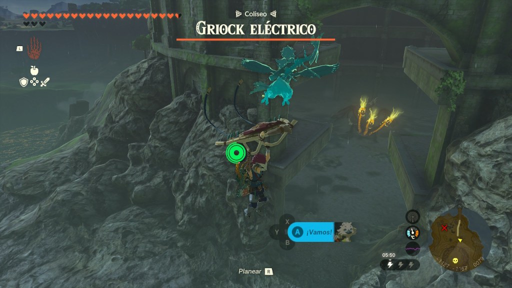 Exploré un poco más la región y me encontré con Darunara sobre una montaña. Me propuso un sencillo juego de golpear una campana lo más fuerte posible. Adherí un cohete a una roca y logré un nuevo récord. Di la vuelta a la montaña y encontré un coliseo. Ahí esperaba un Griock Eléctrico. Creo que aun no estoy preparado para enfrentarlos, así que hui rápidamente de ahí.