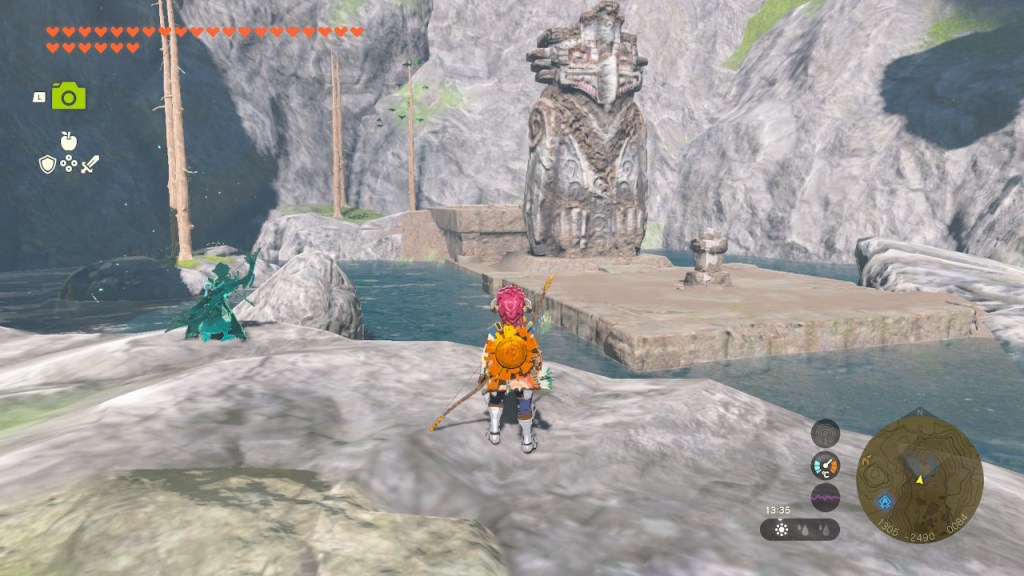Tras derrotar a algunos enemigos me encontré con un gólem ayudante. Quería que acoplase en unas ranuras unas llaves que nacen del agua. Me costó entender a lo que se refería. Tenía que helar el agua del río cercano para obtener bloques de hielo con forma de rombo. Después tenía que derretirlos en la hoguera cercana hasta el punto de encajar en las tres ranuras de diferentes tamaños que había en el mural. Una vez hecho apareció un nuevo santuario. Un poco más al sur encontré otro santuario.
