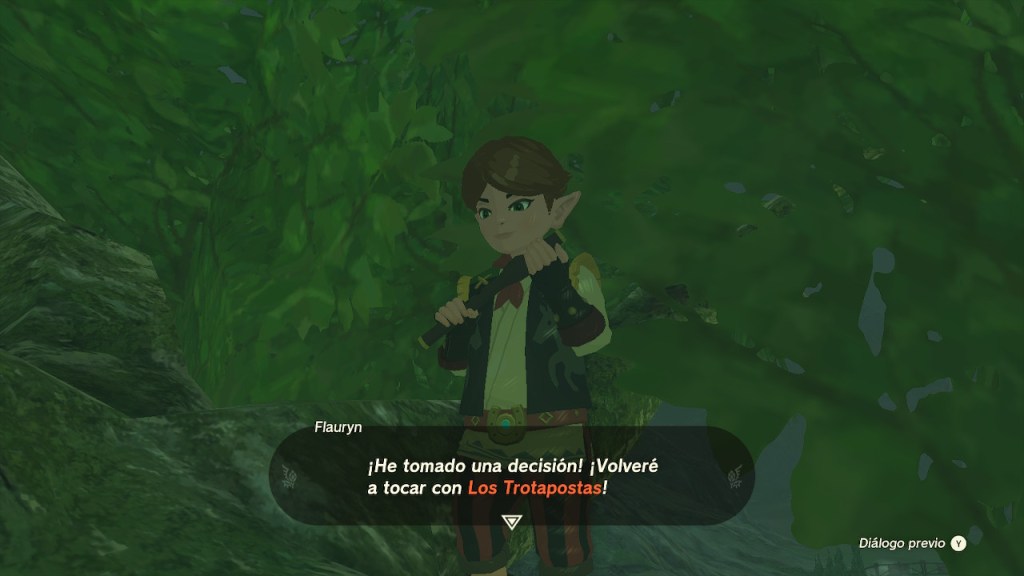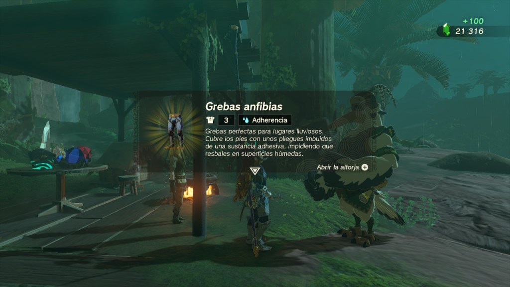 En la zona norte de la selva me encontré con Shima. Esta joven cuidaba de los gondon, una nueva especie animal que descubrió la princesa Zelda. Entonces apareció Penn. El rumor que decía que habían visto a la princesa sobre una bestia venía de aquí, se trataba de estas nuevas criaturas. Otro rumor sobre la princesa solventado. Como ya llevaba 9, me entregó las grebas anfibias como agradecimiento.