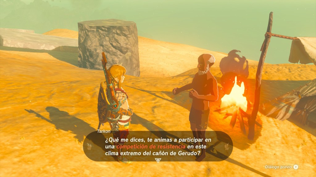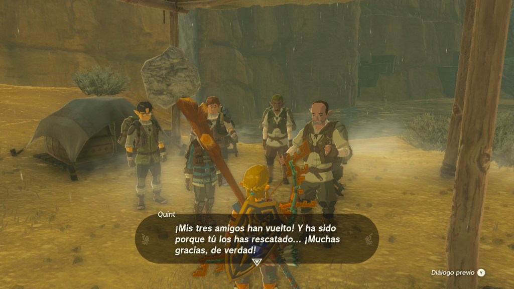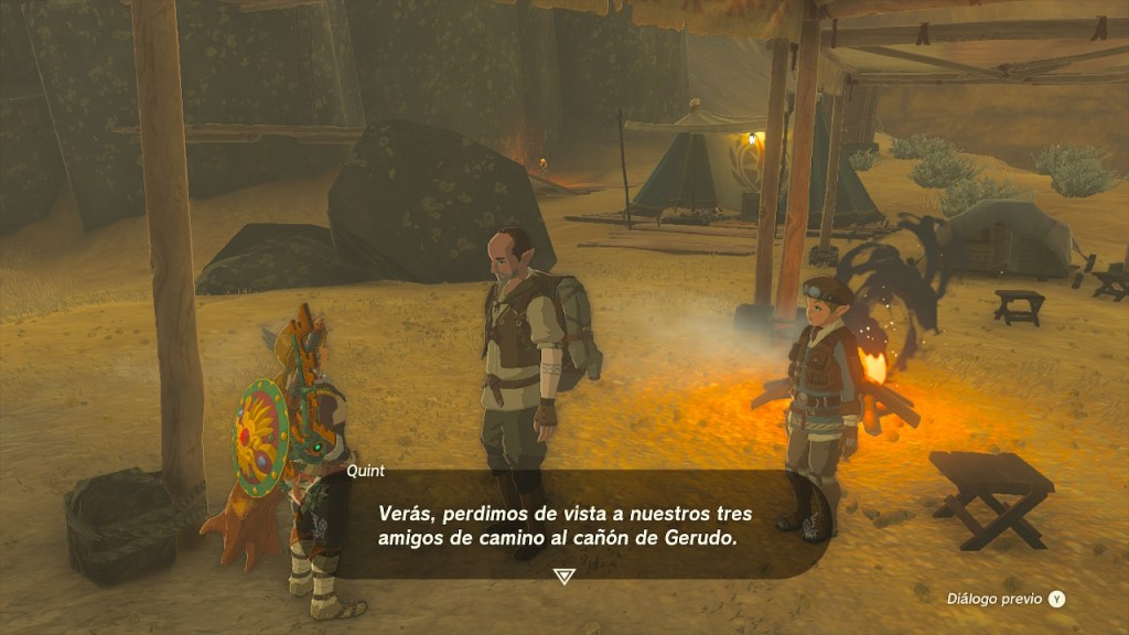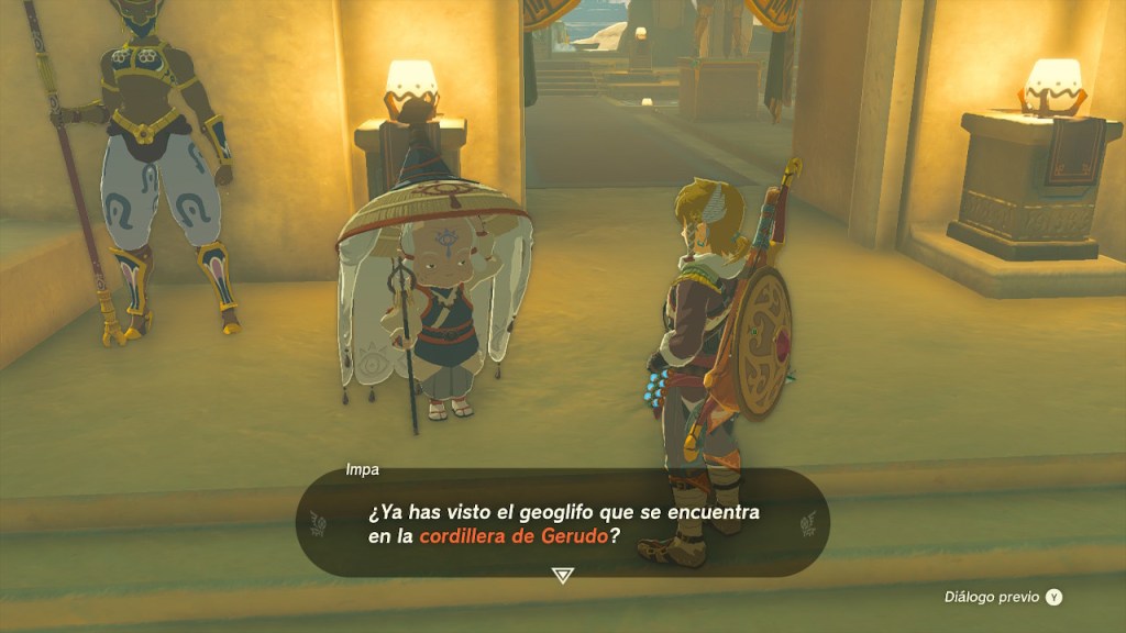 Había ayudado a las gerudo, ahora me tocaba explorar el desierto y completar peticiones. Me encontré con Impa, había venido a investigar el geoglifo de la cordillera de Gerudo. Yo también tengo ganas de visualizarlo. Hablé con Sorenne, me comentó que quería ir a ver unas enormes estatuas que se miran entre sí. Quería atender antes otras peticiones, así que luego volveré.