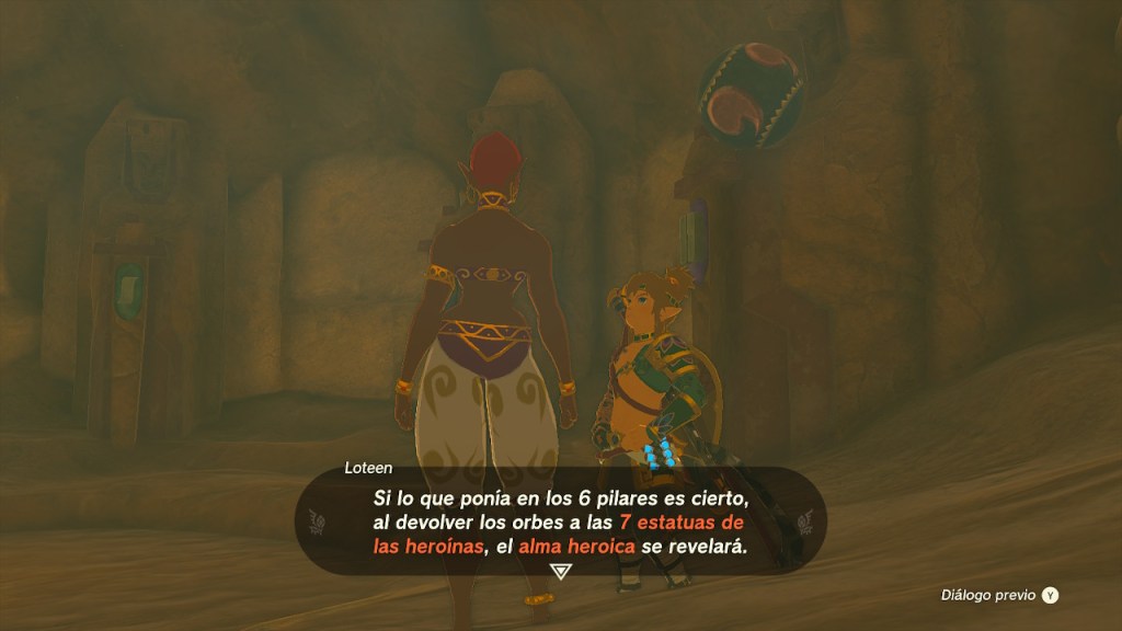 Volví a bajar a las catacumbas. Mejoré el avatar de Riju con las voluntades de los sabios y obtuve un nuevo contenedor de corazón. Di una nueva vuelta por las catacumbas fotografiando los pilares y le entregué todas las fotos a Loteen. Debíamos buscar 7 espíritus de 7 heroínas. Unas extrañas esferas con grabados podrían ser la clave. En una sala más profunda de las catacumbas había 7 estatuas con los mismos grabados. Tenía que buscar las esferas y colocarlas en las estatuas. La primera me la entregó la misma Loteen. Dos más las encontré por las catacumbas. Otras dos las encontré por la ciudadela gerudo. Otra la tenía Tarya. Para entregármela tuve que jugar con ella. Me pidió encontrar un peluche que había escondido en las catacumbas. Fue sencillo. Ya tenía 6 orbes. El séptimo y último ya lo había visto en el bazar Sekken. Tenia que buscar a Theos, el amigo desaparecido de Rost y Benyo. Le encontré perdido en una cueva subterránea. Le ayudé a salir y me entregaron el orbe. Coloqué todos los orbes en sus respectivas heroínas y se abrió un pasadizo. Ahí encontramos un orbe gigante. Tuve que llevarlo al mausoleo al norte de la ciudadela. Lo coloqué y se abrió una verja. Avancé por unos pasillos y acabé llegando a una sala con una enorme estatua. Estaba llena de tesoros y armas. Se lo conté a Loteen.