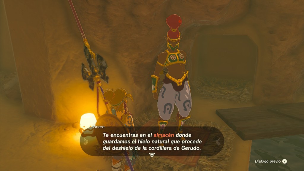 El desierto estaba repleto de arenas movedizas. Algunas con forma de remolino que te engullían y caías a una cueva subterránea. Uno de estos remolinos daba a parar a las ruinas de una antigua prisión. Recorrí los pasillos y activé distintas palancas para levantar las verjas. Me enfrenté a algunos gibdo y terminé llegando a un nuevo santuario. Al norte de la región encontré un almacén de hielo. Anere me dijo que se habían quedado sin hielo. Lancé un fruto gélido al agua y la joven gerudo me pidió que colocase la placa helada en un hueco. Ahora volvían a tener hielo.