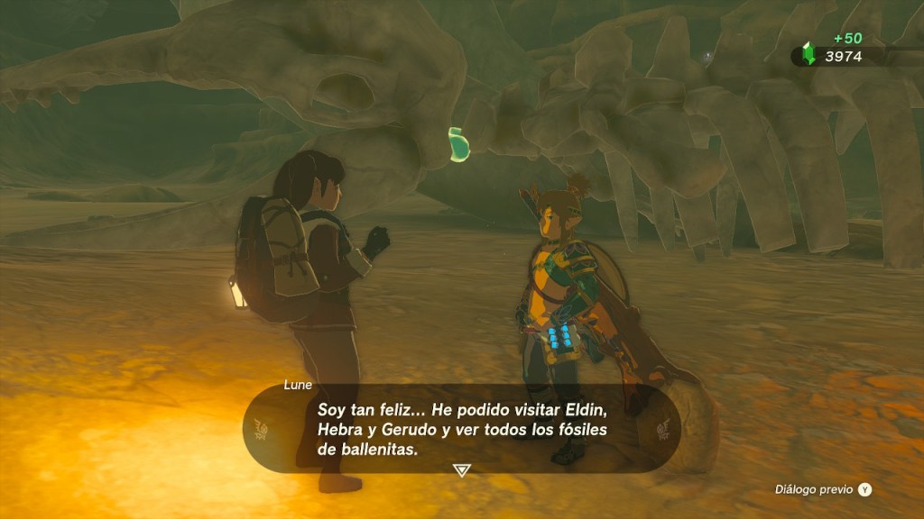 Me fui dirigiendo al suroeste y encontré otro santuario. Rodeé el Templo del Trueno y cerca hallé una cueva. En ella encontré otro fósil gigante. Ahí estaba Lune, la investigadora. Reconstruí el fósil y con este ya estaban todos los del reino reparados. Encontré otro par de santuarios por la parte central y acabé con otro moldora.