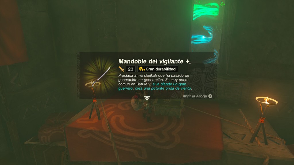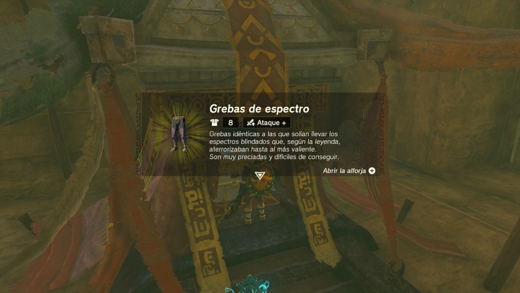 Llegué a una zona en la que había varios remolinos en la arena. Todos conectaban con la misma cueva, pero uno daba a parar a una sala con un cofre. Obtuve las Grebas del espectro. Encontré otro santuario más y acabé con el moldora de la petición del fuerte vigía.