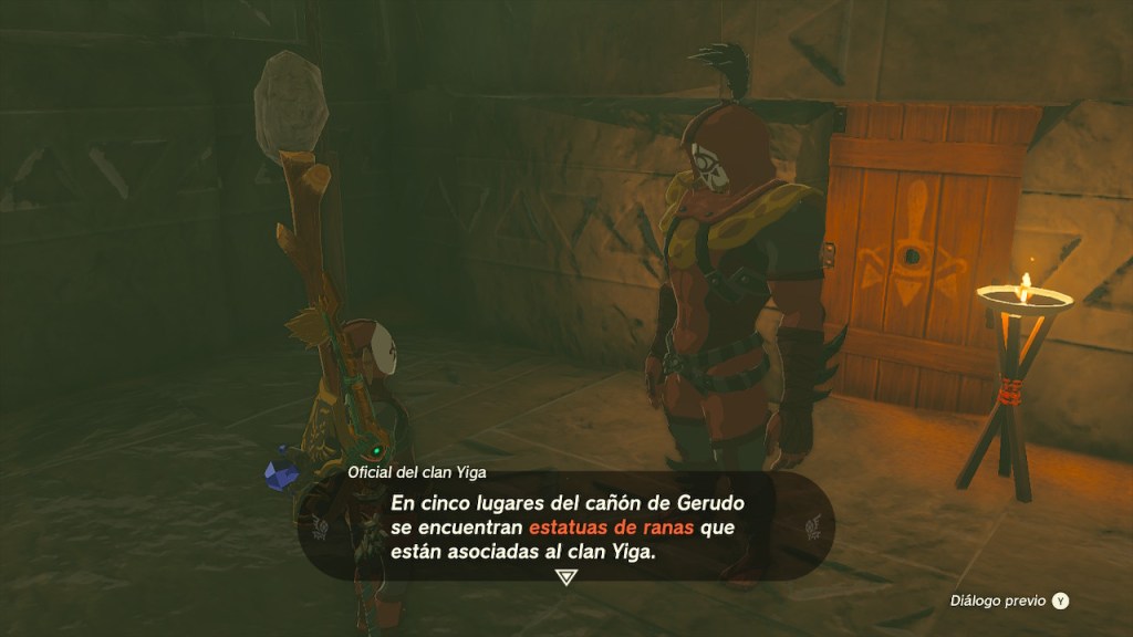 En el lateral de una montaña, oculta tras una cascada, había una puerta. Se trataba de una base del clan Yiga. Me vestí como un esbirro del clan y me permitieron pasar. Me propusieron un examen. Tenía que buscar 5 estatuas de ranas por el cañón y colocarles unos plátanos. Me las marcó en el mapa.