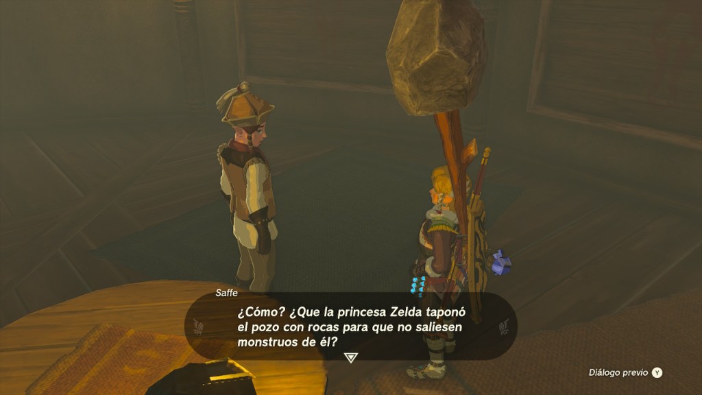 Continué explorando el cañón y llegué a una nueva posta. La posta estaba llena de cajas y el dueño me dijo que no estaba operativa. Me contó también que la princesa les había prohibido utilizar el pozo. Fuera de la posta me encontré con Penn. Había venido por el rumor de la princesa y el pozo. Exploré el pozo y acabé con varios enemigos allí presentes, pero no encontré nada más en él. Cuando se lo conté a Penn dedujo que se trataría de eso, de los monstruos, de ahí que Zelda prohibiese el acceso. Se lo conté también al dueño. Pese a no estar operativa, quiso decorar la posta con un par de cuadros. En el primero de ellos quería una foto de Roca Gafa sonriente. Para el segundo me pidió una instantánea de la gran espada de la cordillera de Gerudo. Tuve que subir a una isla celeste a bastante altura y, utilizando un resto de isla para obtener la forma de roca, pude lograr la foto que me pidió. La cordillera de Gerudo está en la siguiente región, en cuanto pase por ahí le ayudaré a completar el cuadro que falta.
