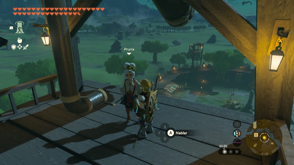 Obtuve un contenedor de corazón y regresé, junto con los elegidos, al fuerte vigía. Se lo contamos a Prunia. Esta dedujo que en todos los lugares que habían visto a la princesa debía deberse a la impostora y que el Rey Demonio había regresado de verdad. Prunia dedujo, de manera muy acertada, que si junto a Rauru había 6 sabios, la princesa Zelda debía representar el tiempo. Y aun así queda todavía otro sabio.