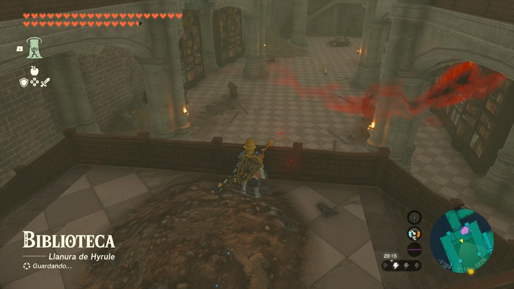 Volví a encontrar a Zelda en la biblioteca. Otro grupo de enemigos apareció nada más desvanecerse la princesa. Acabé con los enemigos y hallé las botas de la guardia real en un cofre tras una de las estanterías.