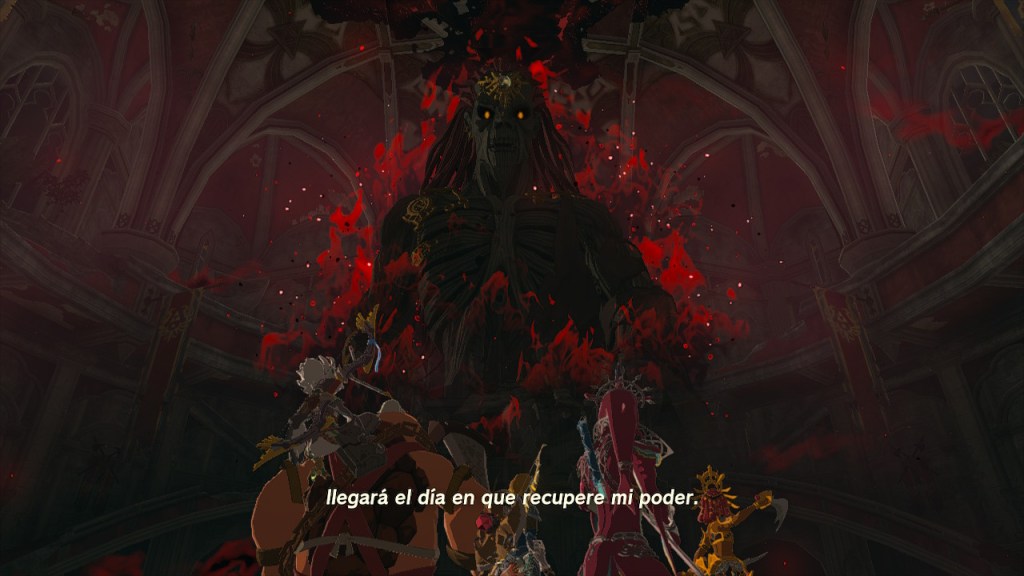 Regresé al castillo de los cielos y seguí a la princesa en dos localizaciones más, teniendo que acabar con diversos enemigos. Entonces se dirigió a la plaza central del castillo, ahí no volvió a huir. Se reveló la verdad. Se trataba de una marioneta de Ganondorf. Restauró la sala del castillo e hizo aparecer a varios Ganon fantasma. Tras acabar con ellos reaparecieron con otras armas. Tras varias oleadas logré acabar con todos ellos. Cuando pensaba que había vencido me atacó con aura maligna. En ese momento aparecieron los elegidos para protegerme. Ganondorf reconoció las piedras secretas. Entonces decidió mostrarnos un recuerdo. Vimos al Rey Demonio invocando criaturas y asolando el reino de Hyrule con su ejército. Nos advirtió que algún día recuperaría su poder y nada podría detenerle. Y no quedaba mucho para su regreso con todo su poder.