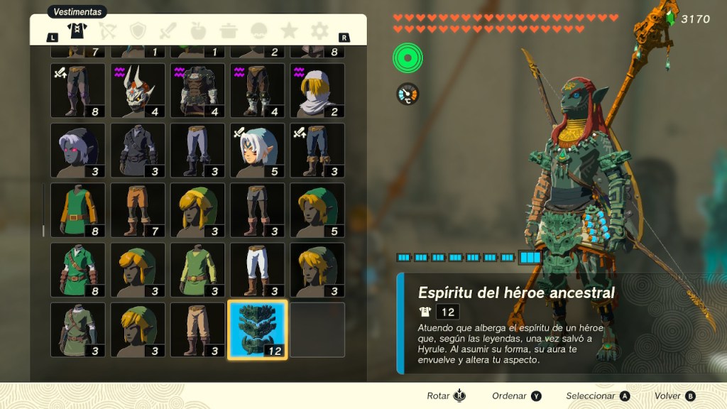 Se trataba de la isla Cabeza de Dragón. Encontré otra voluntad de los sabios en un cofre. En el centro de la isla había un enorme templo. Entré por la parte superior y encontré un santuario. Se trataba del último santuario. Al completarlo la estatua de Rauru me pidió que marchase al Templo del Tiempo. Marché hacia allí y obtuve un contenedor de corazón. Había un cofre tras la estatua de la Diosa. Allí hallé el Espíritu del héroe ancestral. Un conjunto que si lo equipaba me cambiaba el aspecto al de un guerrero zonnan, el del héroe de hace 10.000 años.