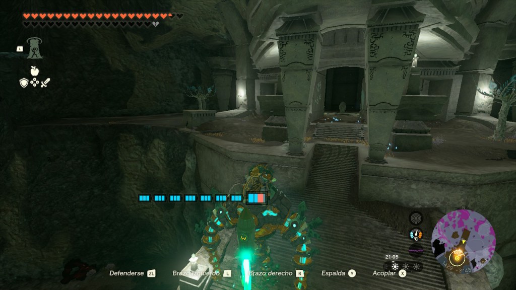 Comencé visitando la factoría de la pierna izquierda. Activé un terminal y obtuve una caja con una pierna de gólem en su interior. Recoloqué un puente. Adherí la caja y unos cohetes a un planeador con turbinas para llegar a la salida superior de la factoría. Salí al exterior y llevé la caja hasta donde Mineru. La caja se rompió y adherí la pierna izquierda al gólem incompleto.