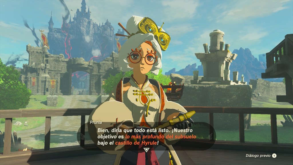 Estaba listo para hablar con Prunia y continuar con mi cometido ahora que las principales tribus del reino estaban dispuestas a ayudarme. Nada más empecé a hablar con ella sucedió el evento de la luna carmesí. En ese momento vimos a la princesa Zelda en la sección del castillo que estaba flotando. Prunia me dijo que le pareció haberla visto en alguna otra ocasión. Así que marché a investigarlo.