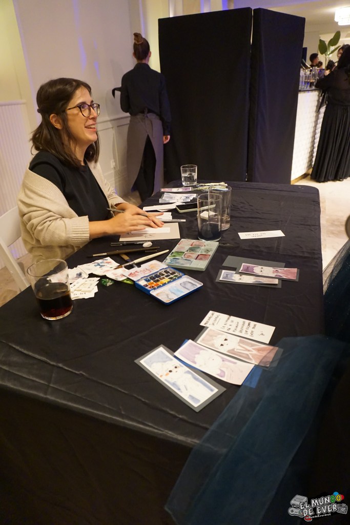 Al lado del puesto de venta de libros pusieron otra mesa donde Natalia Torvisco estuvo firmando ejemplares de su libro Piedra y oscuridad. Hubo un puesto Krash Kosmetics donde dos chicas muy simpáticas arreglaban el maquillaje a los asistentes de forma completamente gratuita durante las primeras horas del evento. En la planta baja hubo un puesto donde Carmen QNo dibujaba a los asistentes de forma gratuita en marcapáginas o podías comprarle también uno de los que tuviese hechos de los diferentes personajes de la saga. La recaudación iba íntegramente a una asociación que estuviese ayudando a la tragedia de la Dana de Valencia. Yo me hice con uno. También compré una cosilla en el stand de Ciudad de los sueños. Las chicas son encantadoras y me reconocieron del evento de abril, me hizo mucha ilusión, para qué negarlo.