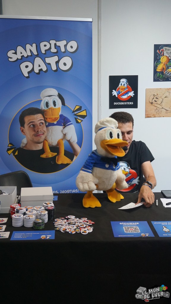 Teníamos también algunos puestos donde los diversos invitados estuvieron interactuando con el público y vendiendo su arte o sus productos. Fue una tremenda sorpresa encontrarme a San Pito Pato, me partí de risa con él (Citroën, ¡hostias!). Entre el resto de invitados podíamos encontrar a Joan Vizcarra y sus famosísimas caricaturas, a Isaac Sánchez (conocidísimo en los lares de internet como Loulogio) con sus cómics y su arte, al dibujante Rodney Ramos al cual compré un comic muy especial que veréis en la entrada de compras o al actor de doblaje Luis Posada. Sé que he mencionado sólo a algunos, pero había muchísimos más de todo tipo de ámbitos, en la web del evento se pueden ver.