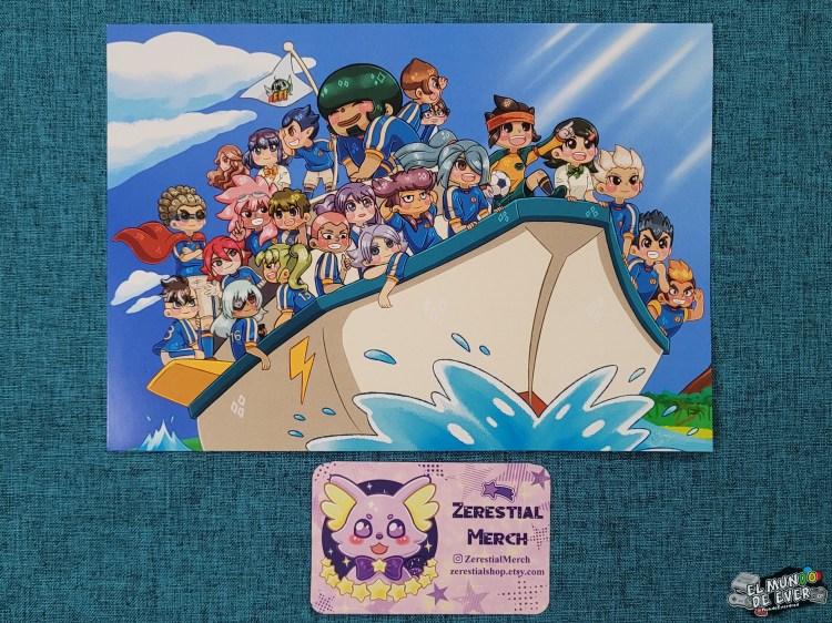 – Lámina A4 de Inazuma Eleven GO!: Quien me conoce sabe que adoro Inazuma Eleven, es de las series de mi vida. Siempre me suele gustar comprar algo y, afortunadamente, cada vez más artistas se animan a hacer cositas de esta serie que, quizás algún día tenga videojuego nuevo (no va a salir en noviembre y todos lo sabemos). Sin embargo, no venía a hablar de ello. Como bien he comentado en el reportaje del evento, vari@s artistas han hecho un rally de Inazuma Eleven. También de otras muchas series pero, tal vez por ser el primero que vi, fue en el que participé. Así que mi primera estación fue este stand y esta comprita.